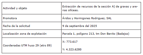 Con fecha 9 de septiembre de 2025, la entidad Áridos y Hormigones Rodríguez, SAL, presentó solicitud de autorización de aprovechamiento de recursos de la sección A) de la Ley de Minas, denominada “El Retamar”, con número 06A01003-00, en el término municipal de Don Benito (Badajoz), así como el correspondiente plan de restauración y el estudio de impacto ambiental del citado aprovechamiento.