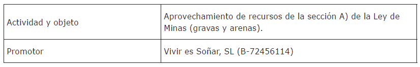 Con fecha 27 de marzo de 2024 se presentó por la entidad Vivir es Soñar, SL, solicitud de autorización de aprovechamiento de recursos de la Sección A) de la Ley de Minas denominado “Charco del Toril”, n.º 06A00997-00, en el término municipal de Don Benito (Badajoz), así como solicitud de autorización del plan de restauración del citado aprovechamiento.